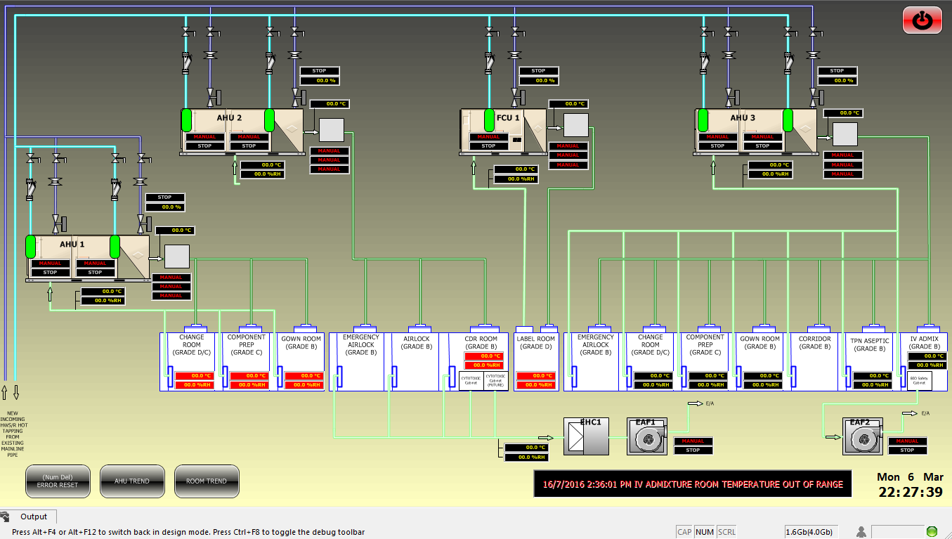 Pumps and valves along pipeline are modulated according to several temperature and pressure readings, while HMI by SCADA system.