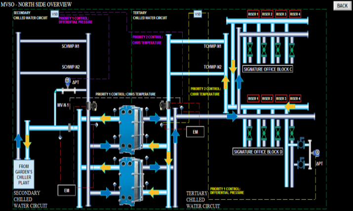 Additional pumps added to draw chilled water from existing pipeline to two intermediate heat exchanger plants, and circulate secondary chilled water from these plants to distribution pipeline of each office block.